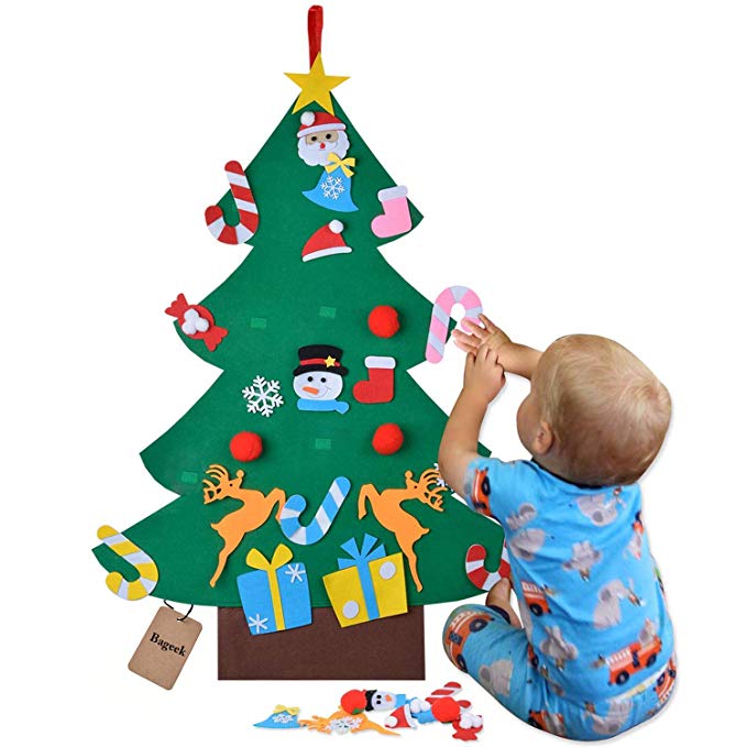 Montar el árbol de Navidad con niños pequeños en casa es difícil, es muy llamativo y los peques acaban tirando de las bolas o de las ramas del árbol. Si no quieres renunciar a la decoración navideña, utiliza este árbol de Navidad de fieltro con adornos con velcro. Los más pequeños podrán participar a la hora de montar el árbol, pegando los adornos de forma sencilla