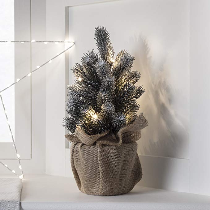 Este árbol de navidad en tamaño reducido tiene unas medidas de 30 cm de altura por 13 de longitud, perfecto para casas pequeñas. Tiene 8 luces led de color blanco, para dar una sensación navideña. Está colocado sobre un base forrada de arpillera muy bonita.