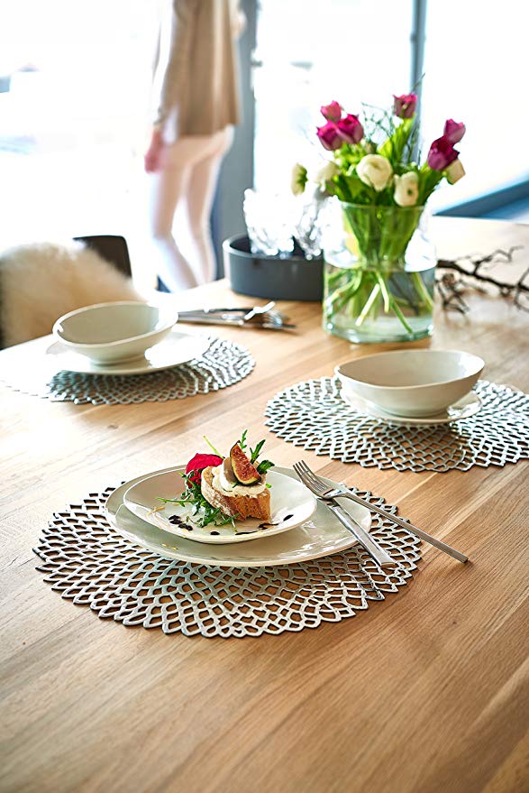 Para que luzca más la mesa, en lugar del mantel de toda la vida, prueba con los manteles de centro de mesa que te hemos sugerido y añade unos salvamanteles dorados bonitos y llamativos como estos que hemos elegido.