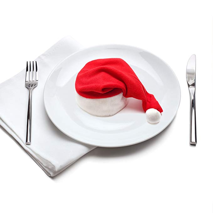 Además de poner la mesa bonita, darle un toque extra de navidad siempre queda bien y atrae la atención de todos los invitados. Si quieres sorprenderles, hazte con una vajilla navideña como esta, o si no quieres comprar una vajilla y prefieres usar la que tienes (esa que guardas para las ocasiones especiales), siempre puedes ponerle un adorno gracioso en los platos como estos gorritos de Papá Noel en el centro del plato.