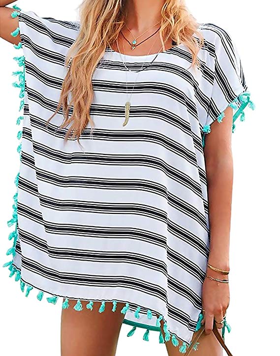 Si te gusta más el estilo bohemio y chic para tus looks de verano y te apetece tener un vestido estilo cover up para ponerte encima de tus bikinis, este que hemos elegido con hombros caídos y borlas y flecos es super boho-chic y una apuesta segura para lucirte en la playa y ser el centro de las miradas.
