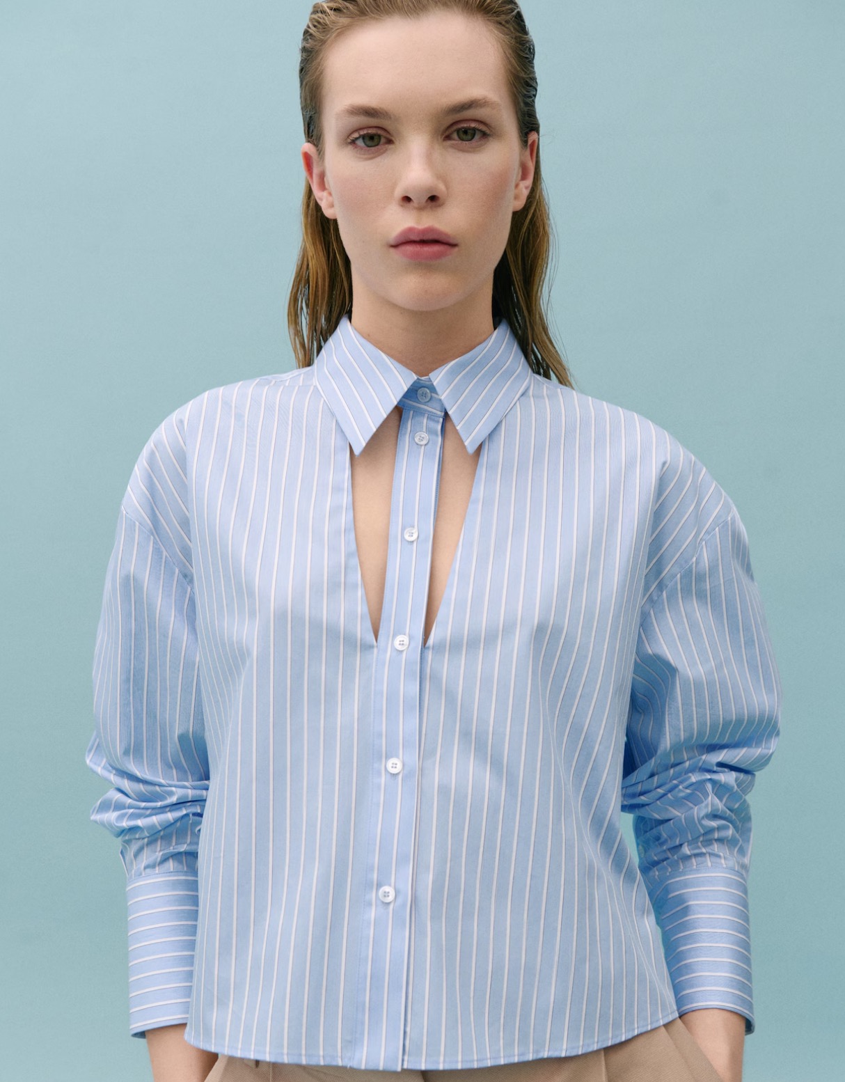 Se trata de una camisa de rayas de color blanco y azul, con un corte cropped (más cortita que las camisas clásicas) y con unas curiosas aberturas en el pecho.