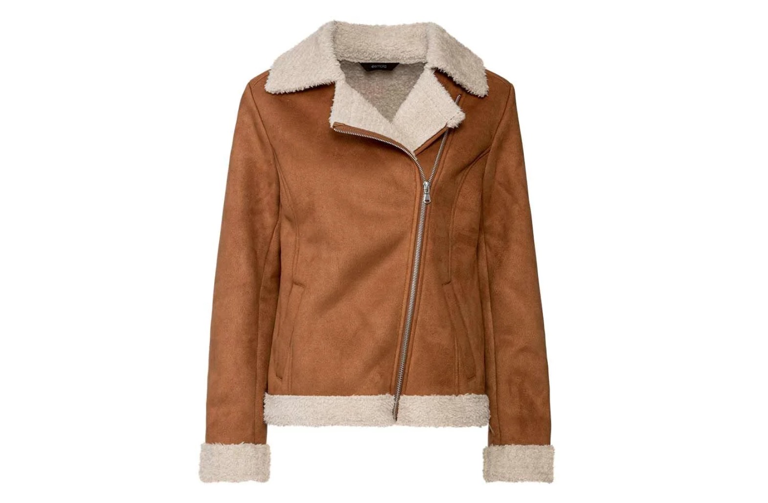 Tiene una cremallera asimétrica y cuello ancha de solapa. Tiene bolsillos a los lados y acabados tipo borreguito en puños y bajo.