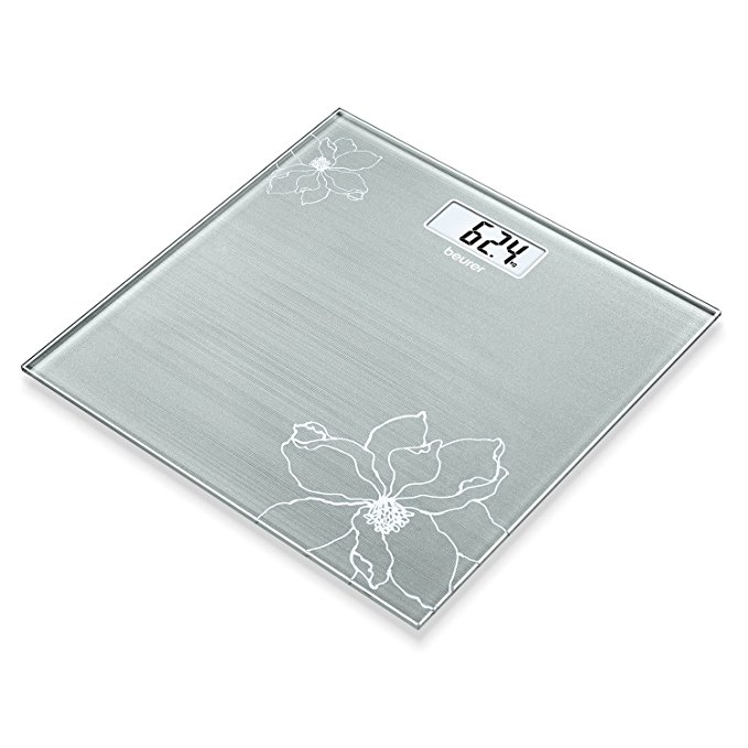 La báscula de Beurer tiene un bonito diseño floral muy discreto con efecto purpurina y una base de cristal grisáceo ultra fina, que le dará un puntazo de decoración a tu baño.