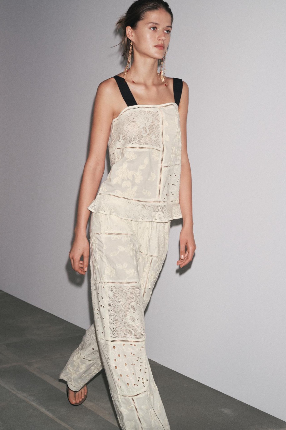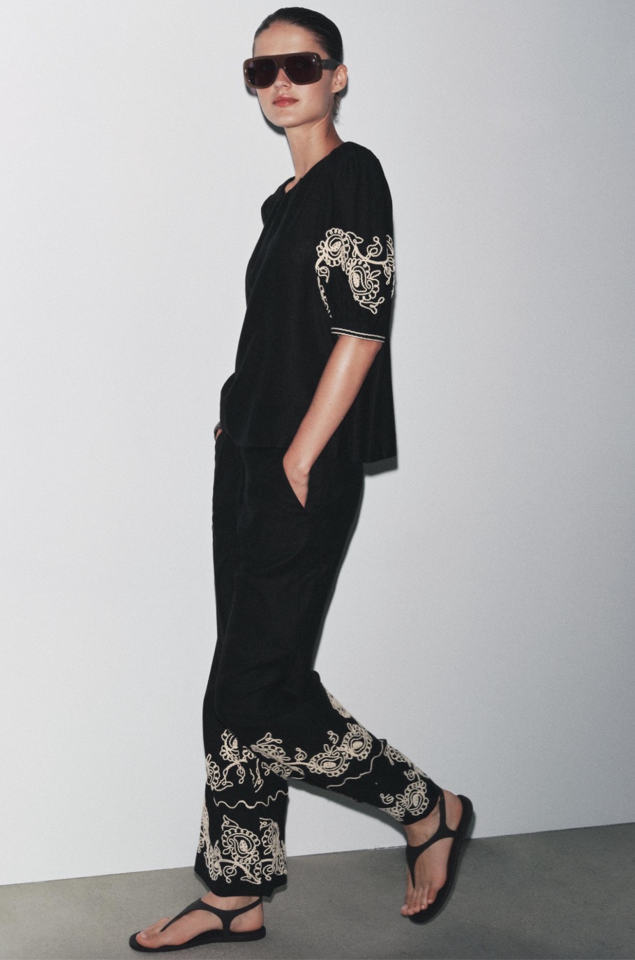 Los pantalones con bordados son tendencia y visten un montón. Son lo último en moda y resultan favorecedores. Esta apuesta de Zara está disponible con tiro medio y mezcla lino y viscosa. Tiene bolsillos y resulta súper cómodo.