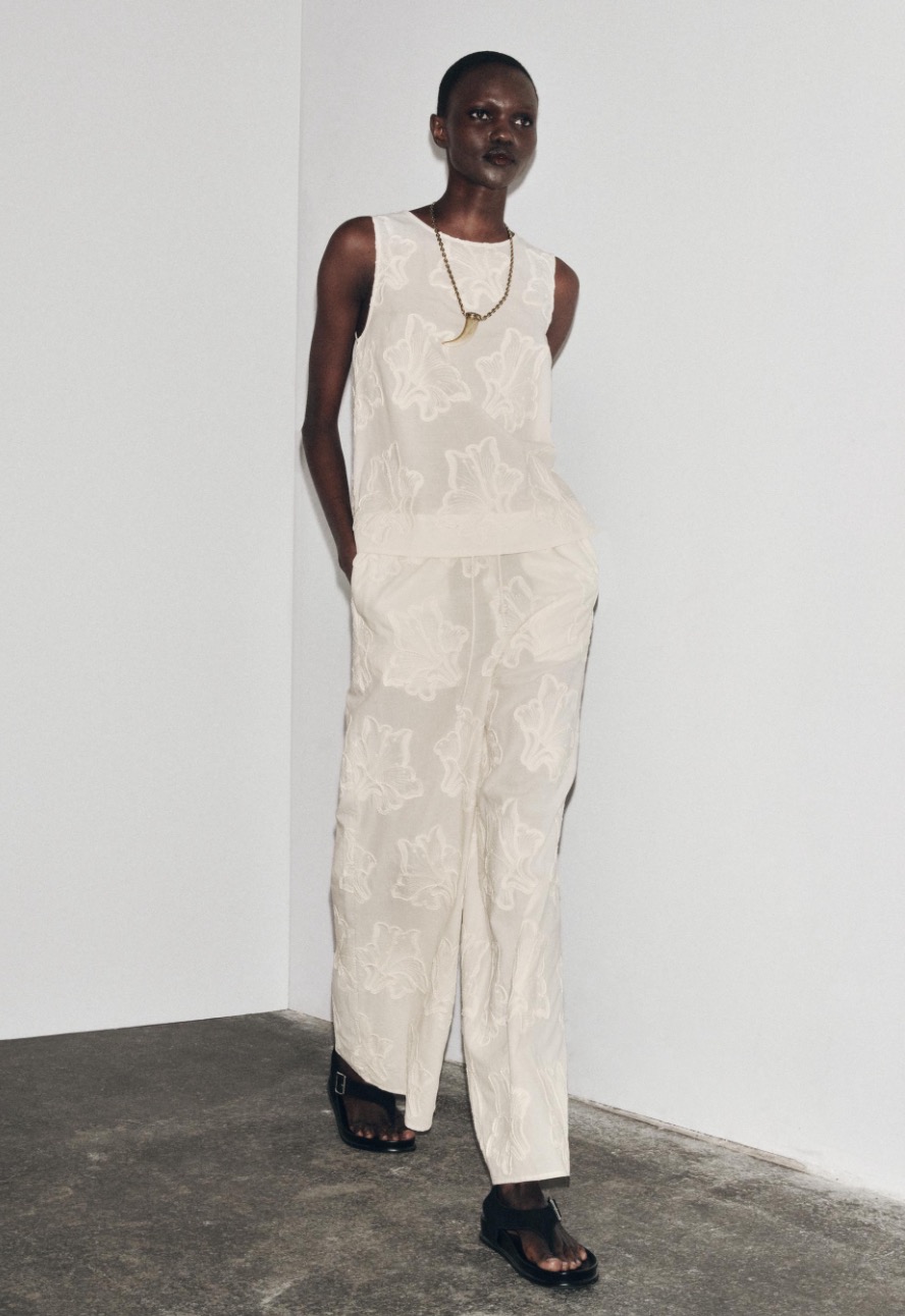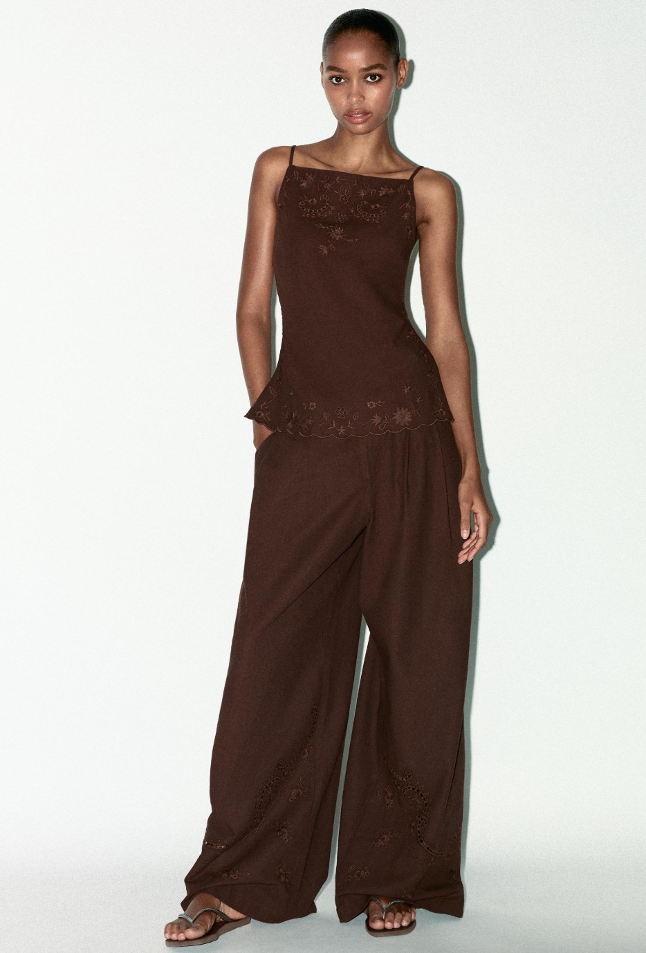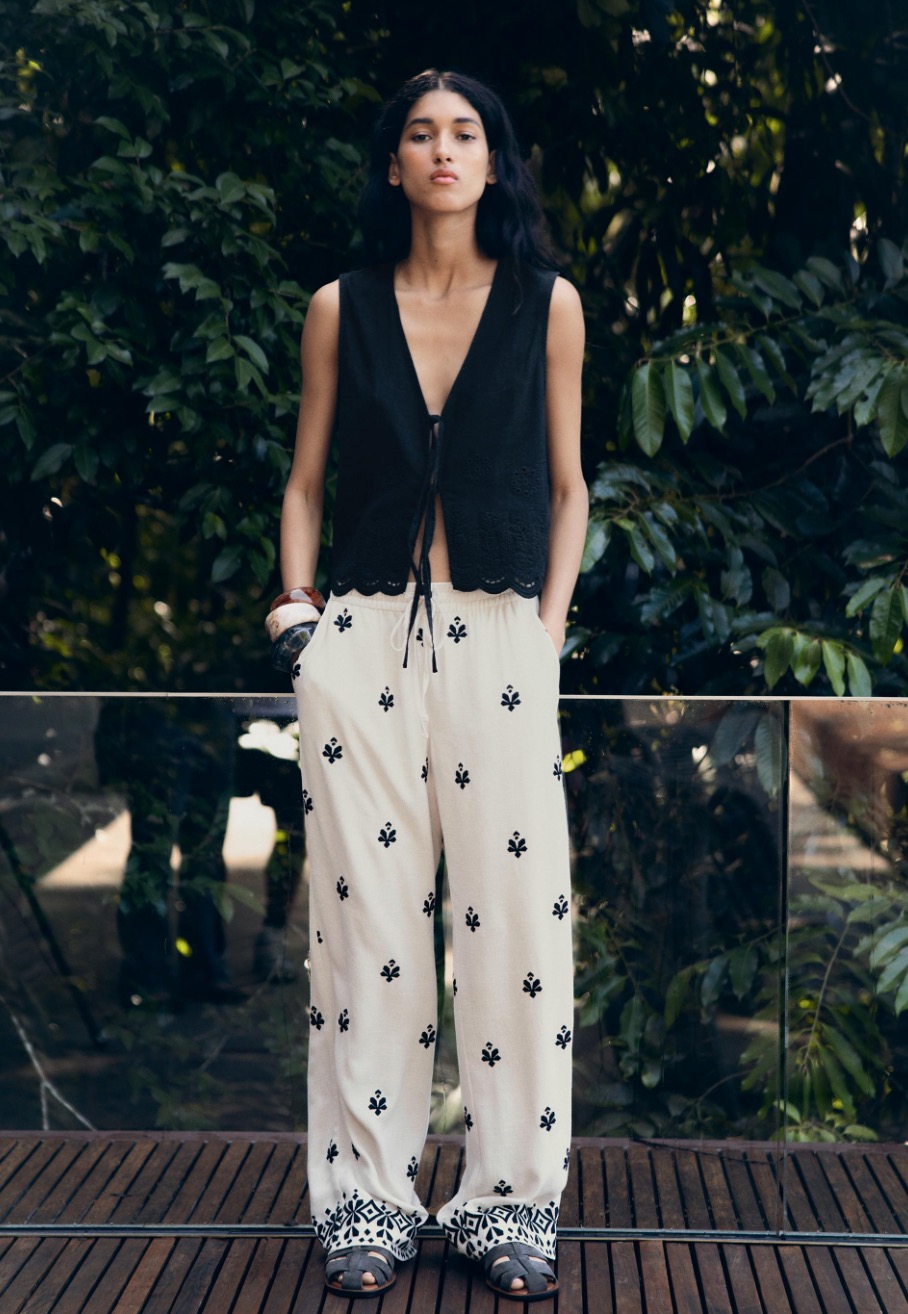 Otro de los pantalones fluidos más monos de Zara es este, estilo pijamero. Es de tiro medio, con bordados y está disponible en dos colores, en crudo y en marrón. Viste un montón.