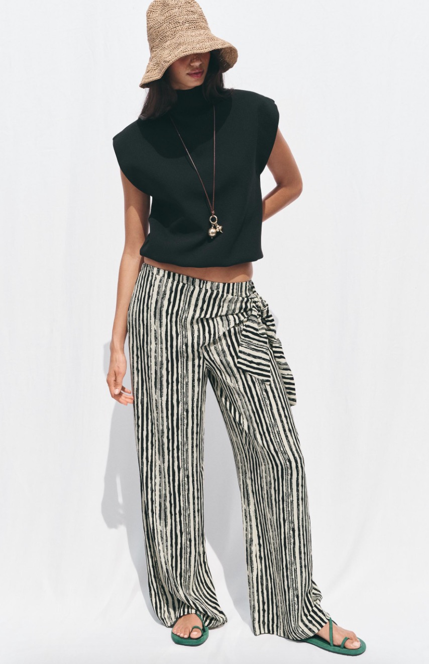 Este pantalón con diseño a rayas blancas y negras es uno de los más bonitos y cómodos de la colección actual de Zara. Tiene el detalle original de un nudo delantero y cierre en la espalda con cremallera oculta.