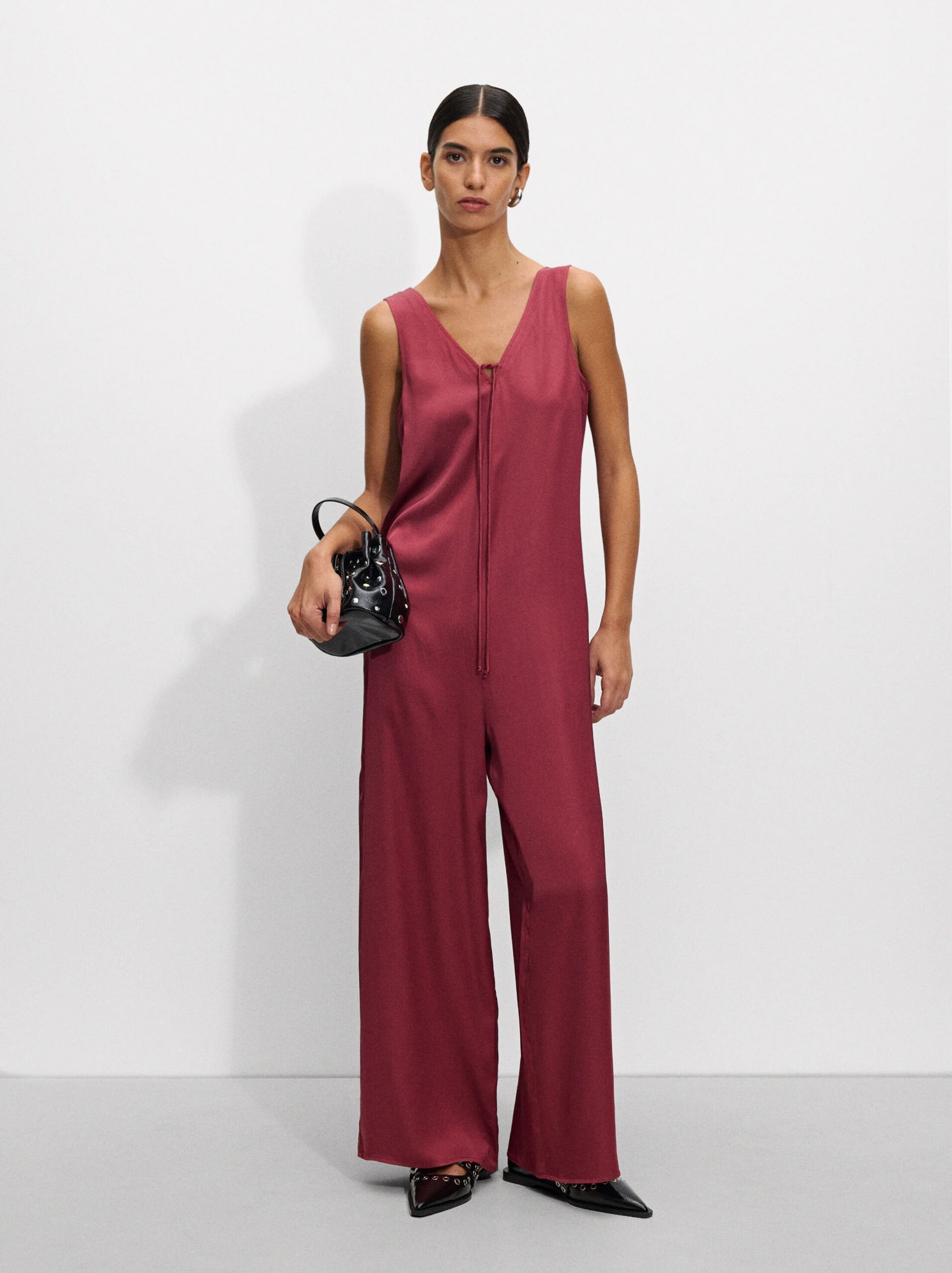 Con pernera ancha, que estiliza y alarga la figura visualmente, y un escote en pico con lazo, consigue crear un efecto favorecedor sin marcar demasiado. Su manga sisa lo hace ideal para esta temporada de verano y, gracias a su tono burdeos, uno de los colores que no pasa de moda, es fácil de adaptar tanto para fiestas de día como de noche. Y no solo eso, sino que el acabado satinado le da un aire muy elegante a la prenda.
