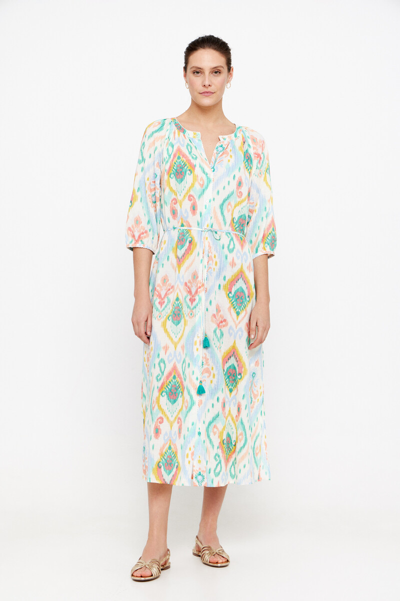 El primer vestido que te proponemos es largo, blanco y con estampado de algodón (60% algodón, 40% viscosa) con escote redondo. Cuenta con manga francesa acabada en puño y cinturón del mismo tejido. Estilo camisero, abotonado de arriba a abajo y con colores muy alegres perfecto para la época estival. Su precio es de 19,99€ y está disponible en todas las tallas desde la S a la XXL. Su precio original era de 79,99€, por lo que tiene un 75% de descuento.