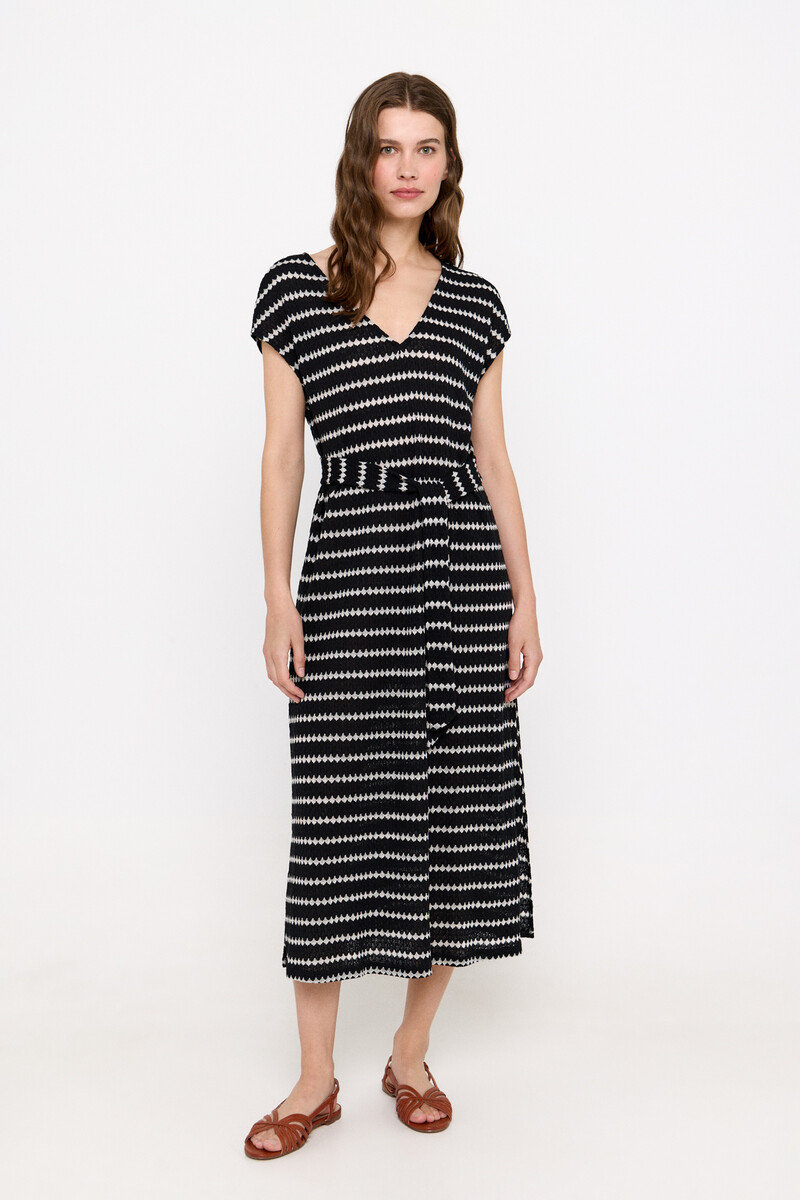 El segundo vestido costaba 69,99€, pero con su 57% de descuento podrás conseguirlo a 29,99€. Tiene un tejido elástico muy cómodo, con mangas caídas, escote pico y silueta amplia. Es un vestido de rayas con aberturas laterales y cinturón del mismo color. Está disponible en tres colores: negro con rayas blancas, arena con rayas beige y kaki con rayas beige. El tejido es un 75% poliéster y 25% algodón y te quedará estupendo con unas sandalias planas para un look informal pero sofisticado.