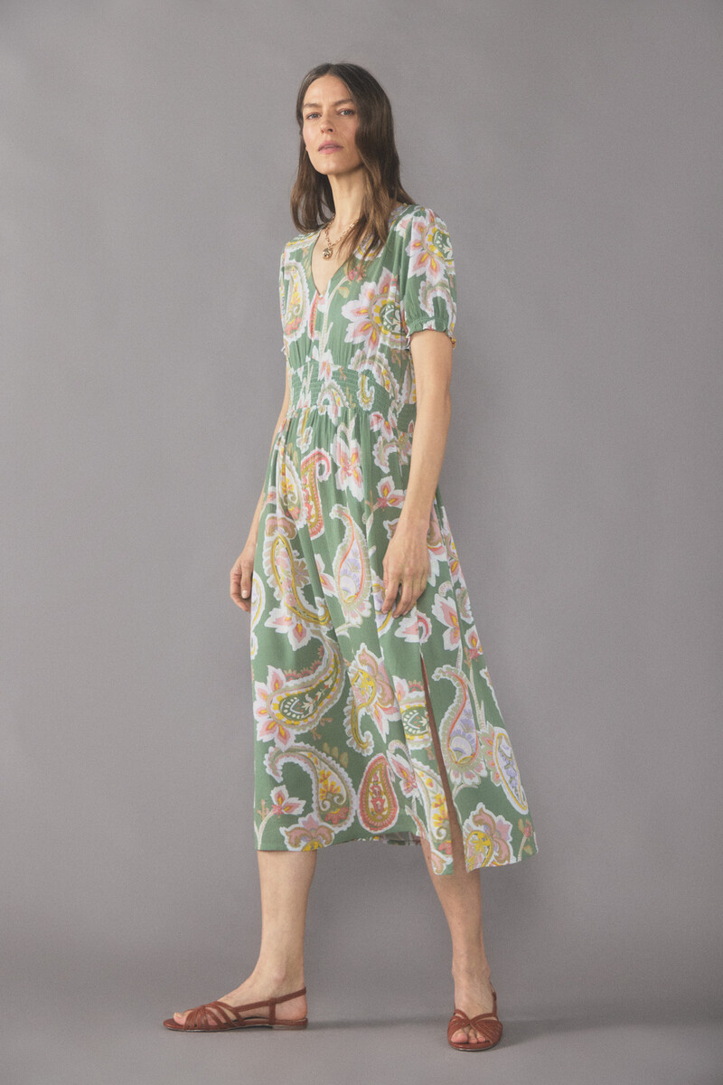El siguiente vestido que te proponemos es este modelo largo con escote en pico. Hay cuatro estampados disponibles, multicolor, blanco, verde y rojo. Tiene gomas en la cintura y en las mangas, que son cortitas. Está compuesto por 100% viscosa y es un tipo de tejido con arruga. El precio es también de 19,99€, de los 69,99€ iniciales.