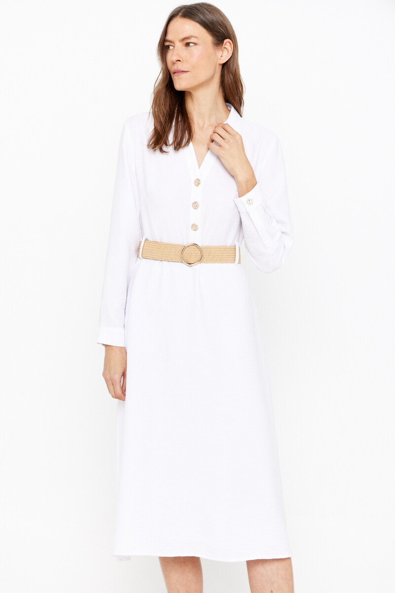 El último modelo que te queremos enseñar es este vestido camisero blanco con cinturón. Un vestido midi de cuello camisero con escote pico y manga larga acabada en puño. Cuenta con cierre frontal con botones y cinturón del mismo color. Un modelo muy elegante perfecto para un encuentro más formal. También a 19,99€, date prisa si te gusta porque quedan muy pocos disponibles.