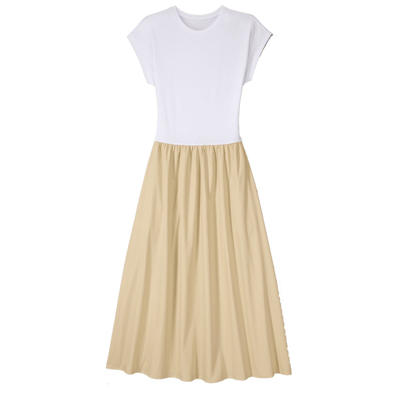 El segundo diseño es un vestido midi de manga corta y cuello redondo, con cintura elástica que estiliza. Destaca por su bajo con acabado fluido y un tejido combinado en tonos blanco y beige, dos colores que no pasan de moda y quedan genial con cualquier outfit. Su estilo relajado y elegante lo convierte en el vestido ideal para llevar con alpargatas en agosto o con botines cuando refresque.
