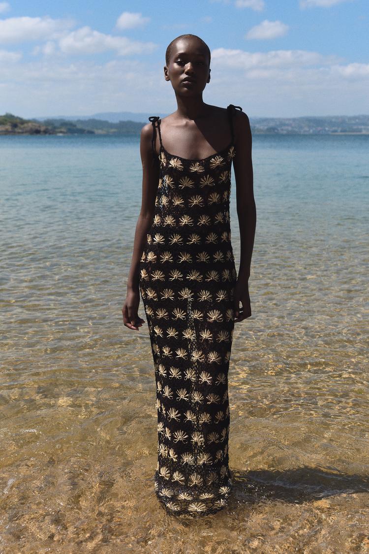 Este vestido largo de crochet de Zara, por 59,95 euros, es sencillo a la par que elegante. Con un escote recto y tirantes finos rematados con lazos, es una prenda que aportará frescura en los días más cálidos. Ideal para lucir sobre un traje de baño o con un forro ligero, este vestido se convertirá en tu aliado para las tardes de verano más chic. ¡No te lo pierdas!