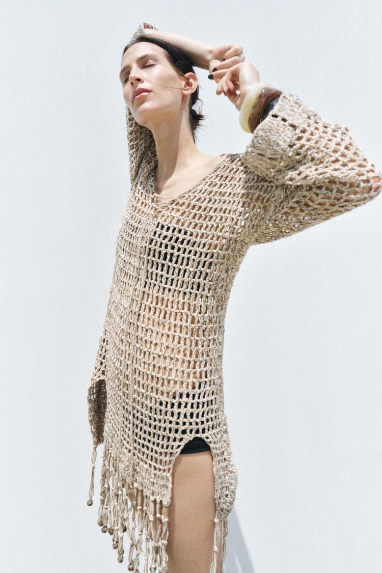 Este vestido kaftán de crochet con borlas de Zara, disponible por 59,95 euros es la combinación perfecta de boho y elegante. Con un escote en pico y mangas que caen justo por debajo del codo, es ideal para esos días en los que buscas comodidad sin renunciar al estilo. El bajo acabado con borlas le da el toque de personalidad y encanto a la prenda.