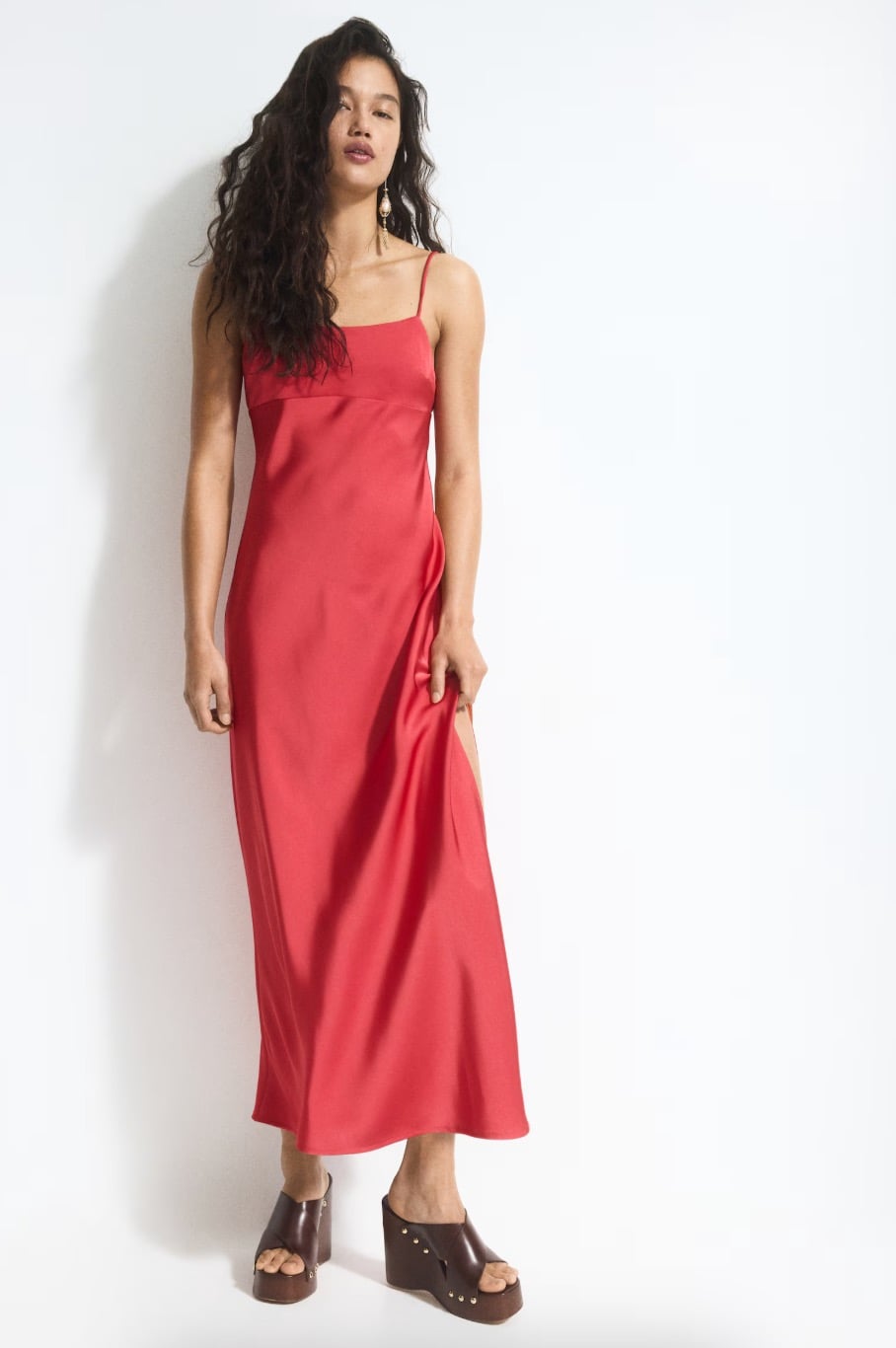 Otro de los vestidos lencero de la temporada es este modelo de H&M, rebajadísimo y en varios colores a elegir. El rojo nos ha conquistado el corazón.