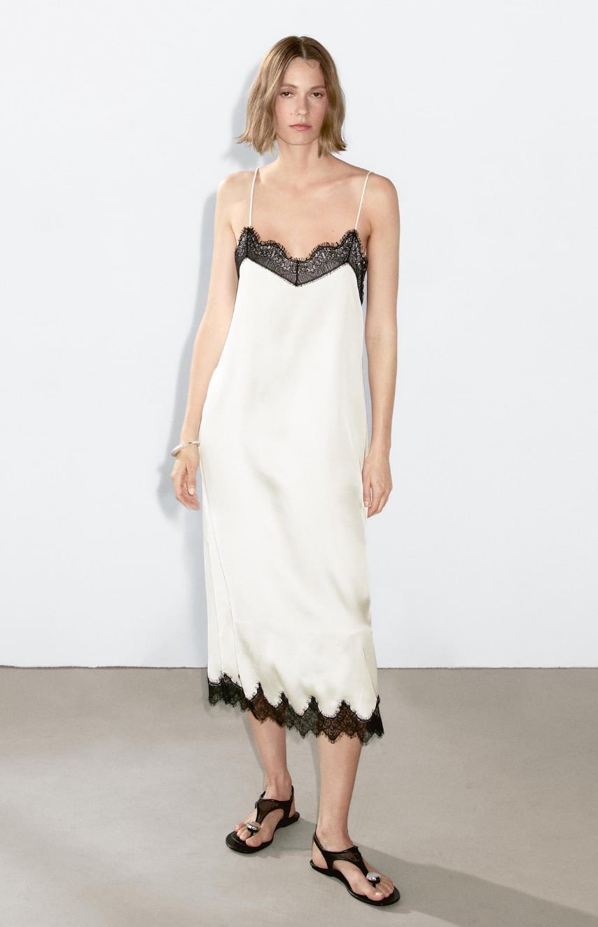 Este vestido lencero de Massimo Dutti es un básico que no puede faltar en ningún armario. Es en color crudo, con detalles de puntilla con contraste en color negro, en la parte del escote y del bajo. Tiene un favorecedor escote en la espalda y tirantes finos. Muy mono.