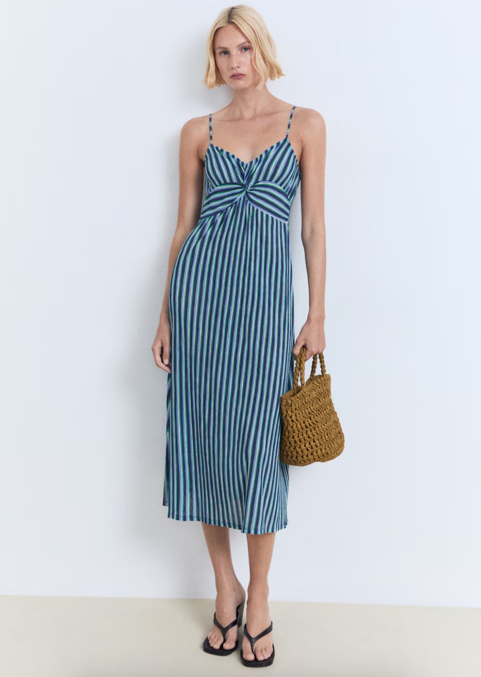 Este vestido de Mango tiene uno de los diseños más bonitos que hemos visto esta temporada. Enamora por su estampado a rayas, en tonos verde, azul y blanco. Resulta fresquito, favorecedor y está disponible también en color rojo. Elige tu favorito. Su precio e sde 25,95 euros.