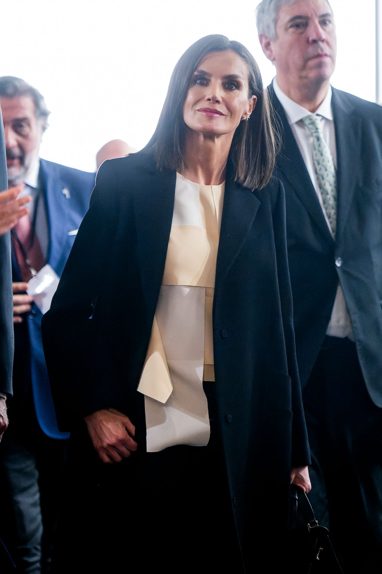 La Reina siempre sorprende con sus estilismos para la ocasión, y este año ha elegido un look sobrio pero con toque muy artístico, ayudada por su estilista Eva Fernández. Letizia optó por un pantalón de pinzas negro hasta el tobillo y un abrigo negro de la firma Carolina Herrera. El abrigo largo oversize de solapas y botón fue el protagonista debido a las temperaturas invernales. Desgraciadamente el frío ha impedido que la Reina mostrase completamente la blusa que llevaba, aunque sabemos que es un diseño original de Adolfo Domínguez. En particular esta pieza cuenta con piezas de tela cruzadas en tonos blancos y nude que dan el toque tridimensional. Tiene cuello redondo y es de la temporada pasada de la firma gallega. Era el toque artístico que escondía bajo su abrigo con juegos tridimensionales, asimetrías y acabado deshilachado con efecto collage.