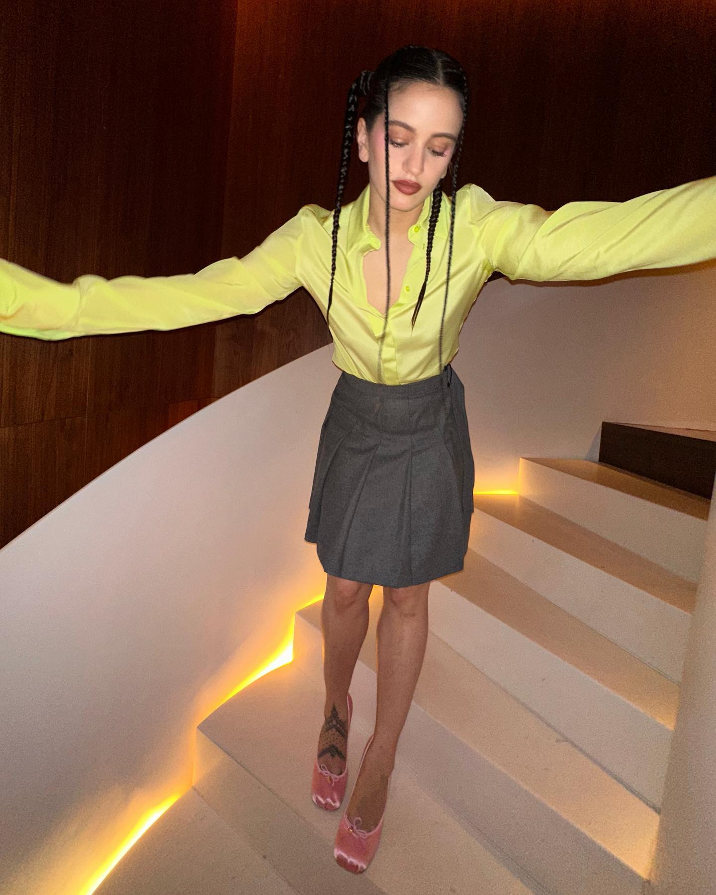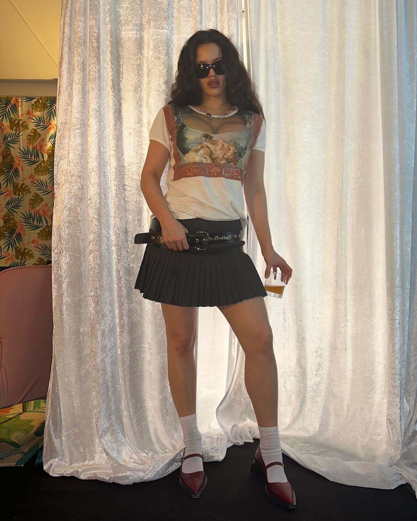 El look colegiala está volviendo con fuerza. La mismísima Rosalía se ha atrevido a combinar la minifalda de tablas con los calcetines blancos altos para recrear el look preppy de un modo más rompedor. Para poner su punto extra, ha elegido una camiseta que simulaba parte de su busto, minifalda negra de tiro bajo con cinturón y pequeñas tablas que daban mucho vuelo al conjunto y zapatos granates con broche y plataforma.