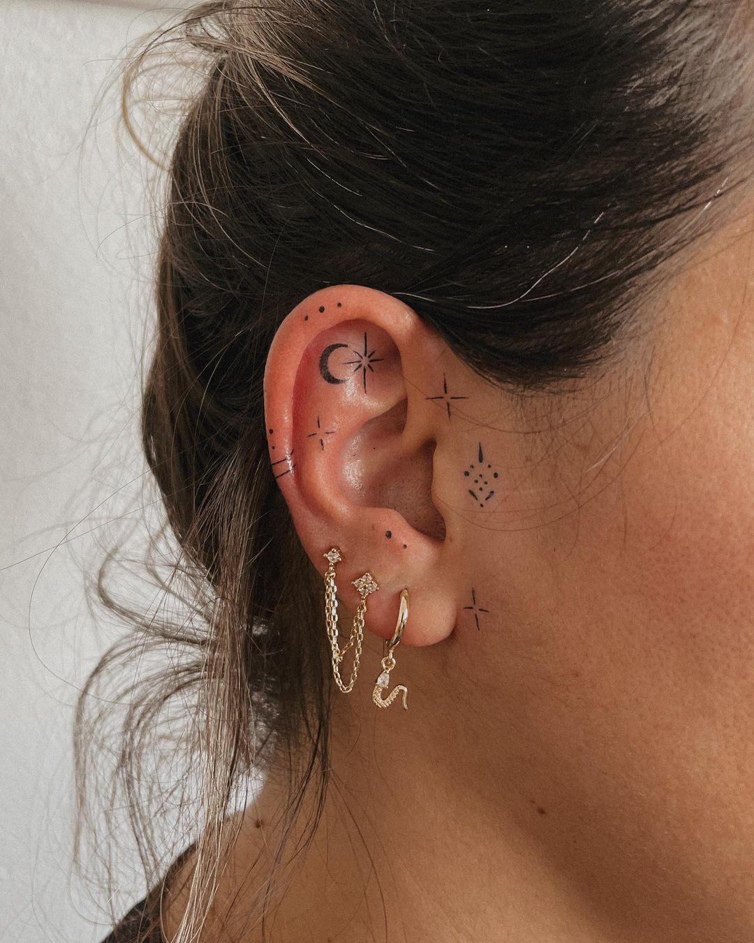 La experta comenta: «Los tatuajes en las orejas han sido una gran declaración de intenciones para los minimalistas al límite, y he visto cómo se hacen cada vez mejor». El hecho de que hayas maximizado la colocación de tus piercings no significa que hayas terminado con los adornos en las orejas.
