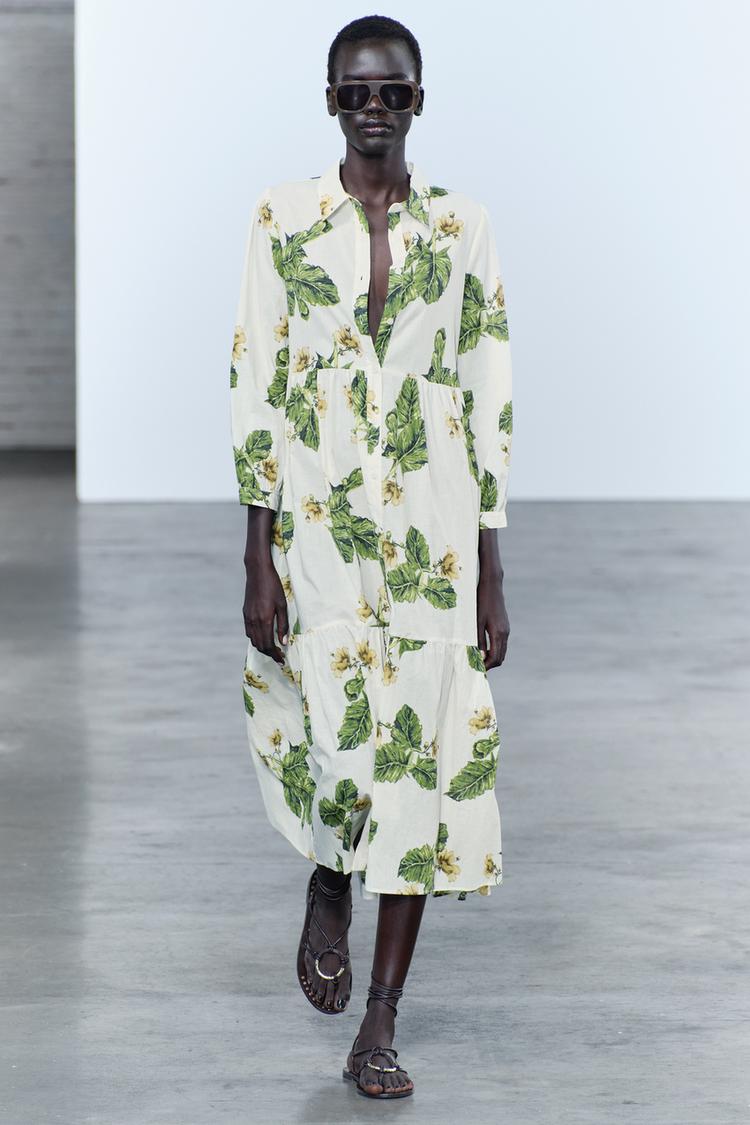 3. El tercer modelo midi también tipo camisero, pero con estampado floral confeccionado en hilatura de algodón 100%. Cuello solapa y manga larga, bajo acabado en vuelo y cierre frontal con botones. En los vestidos largos, un estampado grande hace un efecto flash inmediato, como en este caso, con las grandes hojas verdes y las delicadas flores en tonos vainilla. Este look puede ser tuyo por 39,95€.