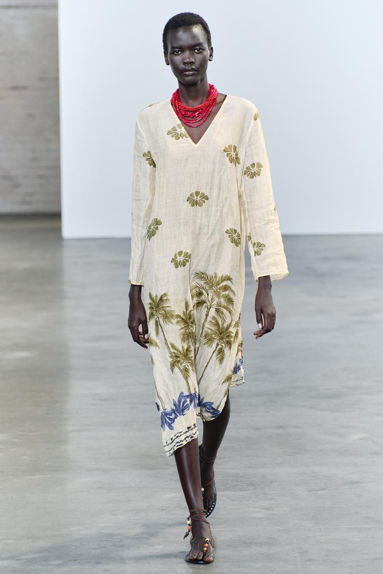 2. Este vestido tipo túnica es ideal para un día en la playa o una tarde relajada por la ciudad. Está hecho con hilatura de ramio 100%, lo que lo hace superfresco y cómodo. Tiene un escote en pico, mangas largas y un estampado de palmeras en verde oliva que resalta sobre el azul intenso. ¡Es perfecto para tus días de verano! Su precio es de 59,95€.
