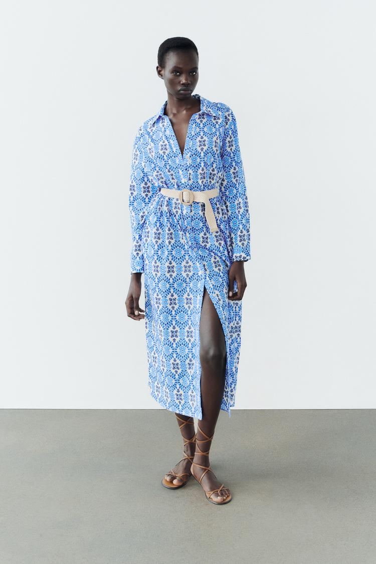 5. El último look que traemos es otro vestido camisero de la colección de verano. Un modelo de cuello solapa y manga larga. Detalle de cinturón del mismo tejido con doble hebilla. Cierre frontal con botones y a 39,95€. Una opción bien colorida para no pasar desapercibida. Date prisa porque en la tienda online ya no quedan todas las tallas.