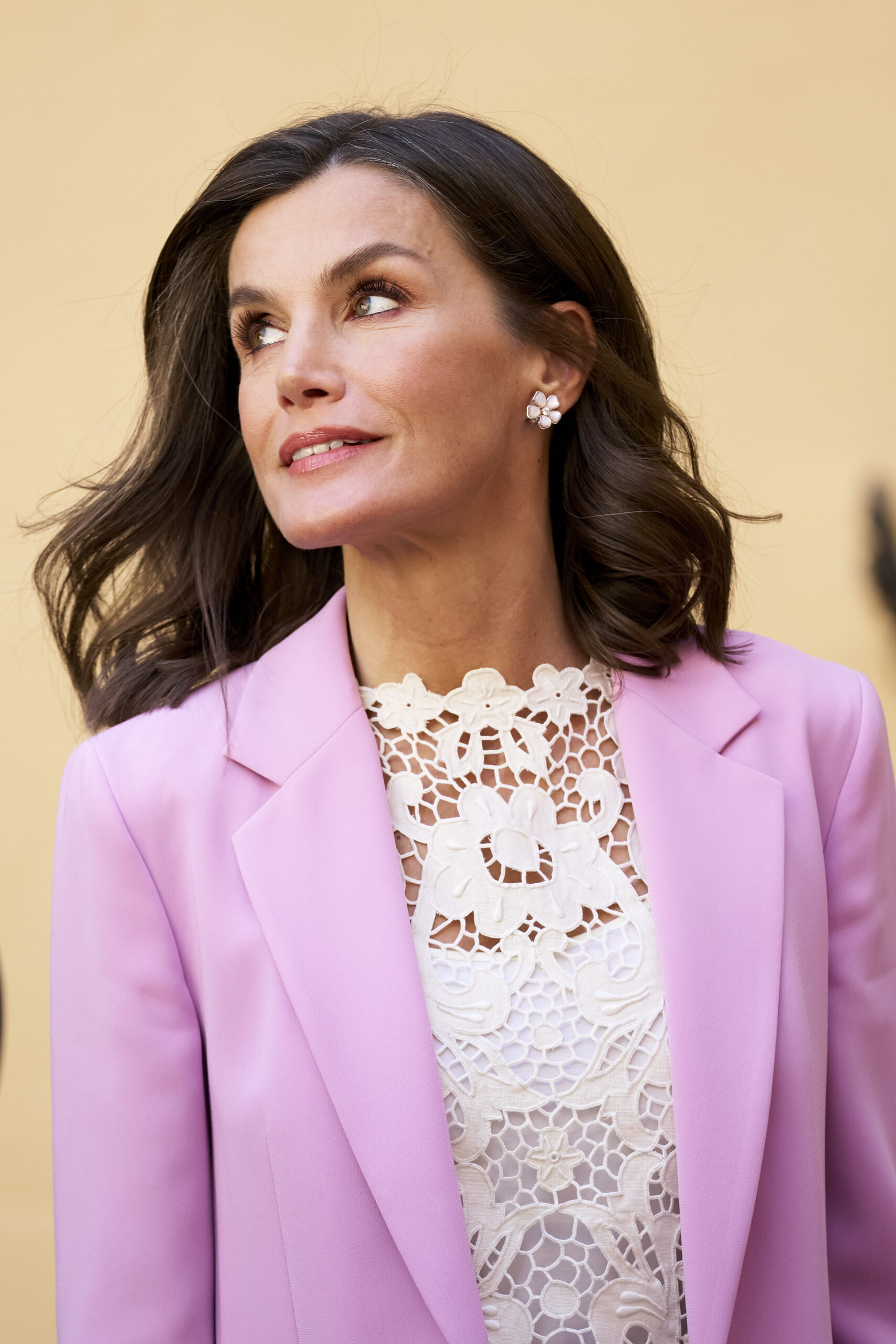 Un traje rosa pastel de Hugo Boss sirvió como base para este estilismo. Una prenda que ya había lucido con anterioridad, pero que en esta ocasión adquirió un nuevo aire gracias a la incorporación de un top floral de Pomeline, firma canaria que ha conquistado el corazón de la Reina.