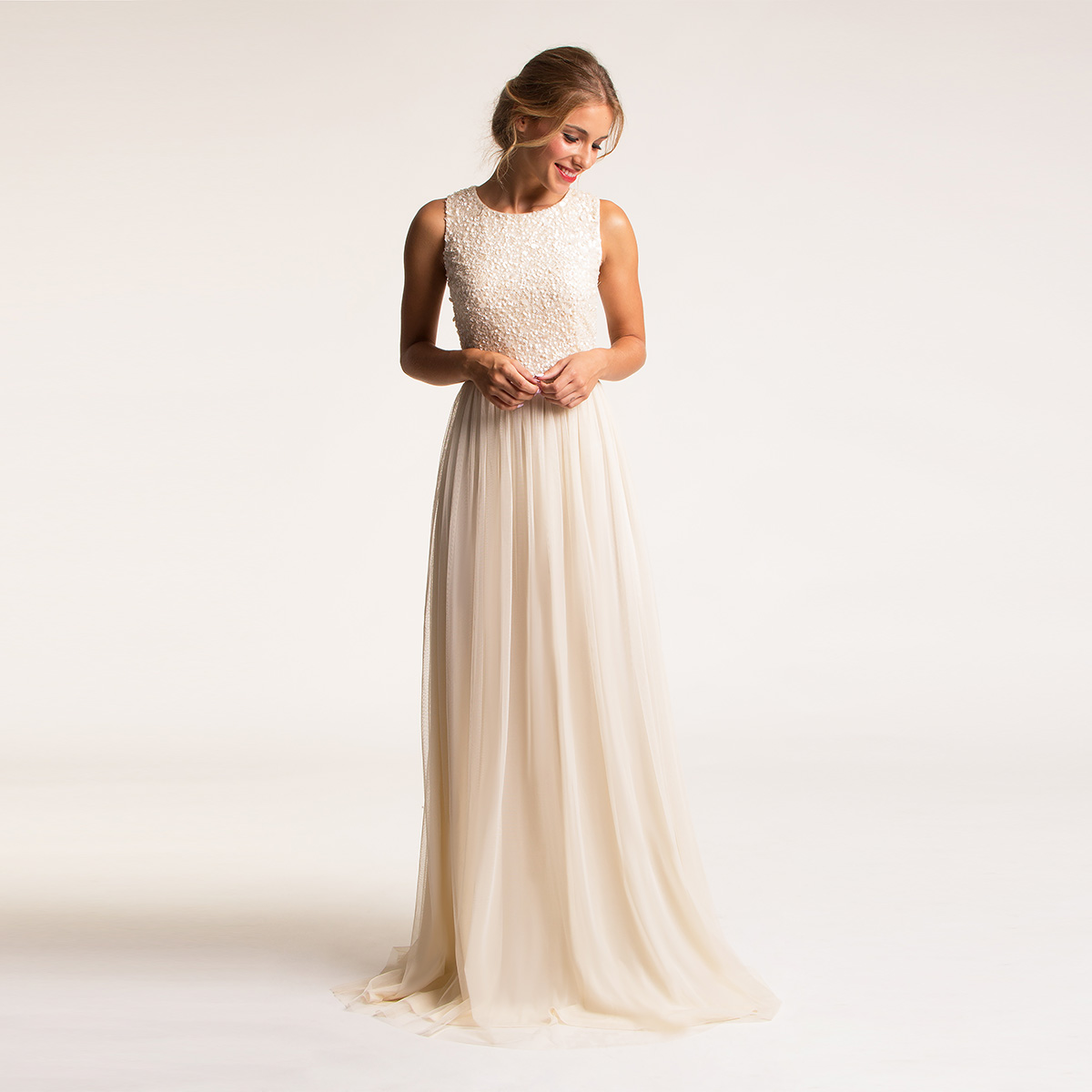 Te dejamos una propuesta del estilo, un vestido de tul sin mangas bordado, que con un recogido informal bordarías tu look perfecto romántico.