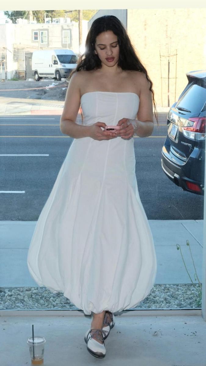 Rosalía ha decidido abandonar su estilo habitual en esta ocasión para adoptar esta tendencia, luciendo un cuerpo ajustado con diseño corsetero, en un hermoso vestido con escote y una amplia falda midi con efecto globo. Este diseño fue presentado en el desfile de primavera-verano 2024, siendo Paloma Wool su creadora. Con un precio de 330 euros, está disponible en lista de espera mediante la página web de la firma.