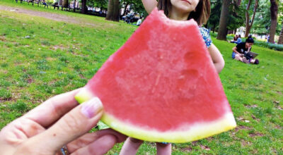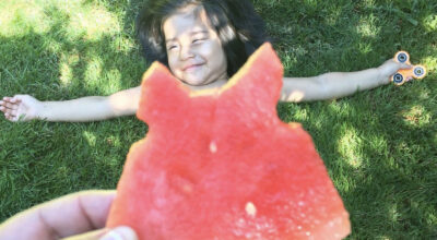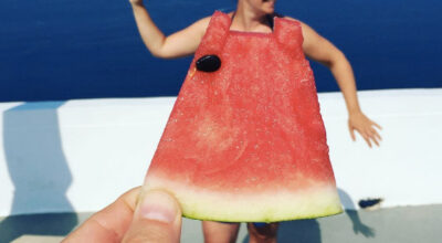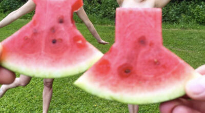 Corta una rebanada de sandía y colócala delante del objetivo de tu móvil frente a la persona a la que vayas a hacer la foto. La ilusión óptica de la perspectiva hará que parezca un vestido de lo más original. Si además eres una manita podrás hasta crear detalles divertidos en tu «peculiar vestido». Un juego para grandes y pequeños con el que pasar un rato de lo más divertido.