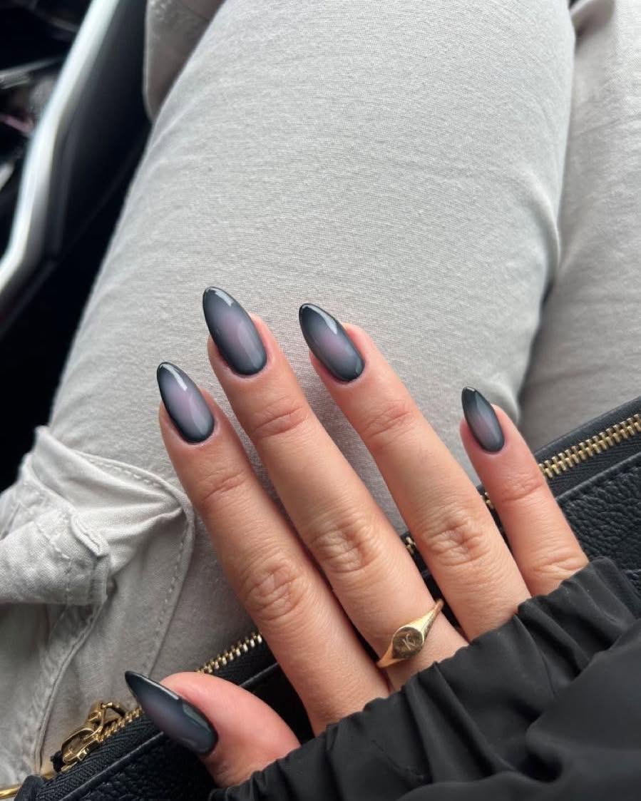Uñas con efecto aura en tonos oscuros y con toques rositas