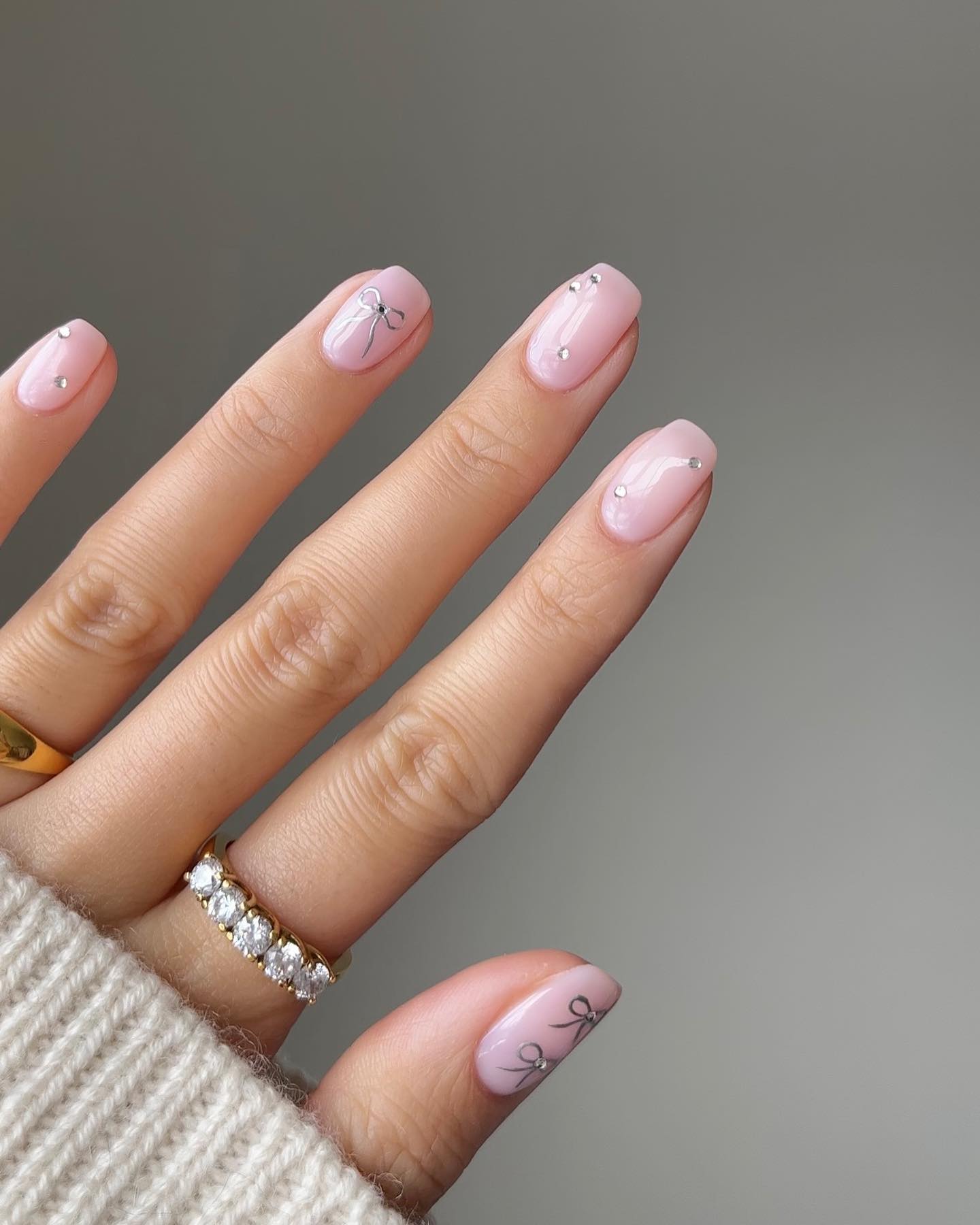 Otra opción ideal para lucir unas uñas rosas elegantes es añadir pequeños diseños en plateado que aportarán un toque original y elegante a tus manos. Los diseños que te muestro a continuación, con delicados lacitos, añaden una dulzura y una elegancia sutil a tus uñas. ¡Perfectos para quienes buscan un estilo único y refinado!