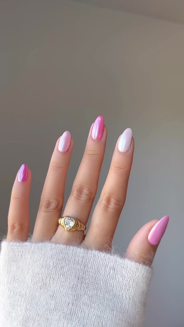 Las uñas en distintos tonos de rosa perlado son una opción exquisita que aporta elegancia a tus manos. La combinación de matices perlados crea un efecto luminoso y multifacético que captura la luz, realzando la belleza natural de tus uñas. Estos tonos suaves y sutiles ofrecen una apariencia refinada y fresca, ideal para el verano.