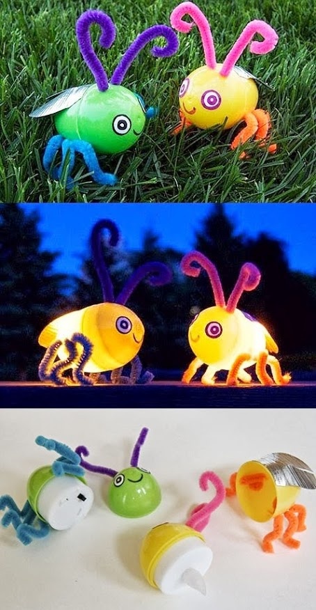 En una de las mitades de la cáscara de huevo Kinder, pinta los ojos de tu luciérnaga. Perfora ambas mitades para luego introducir los alambres que posteriormente serán las piernas de nuestro insecto. En el extremo de una de las cáscaras, pega papel de aluminio lo más tirante que puedas, sobre él pegaremos la luz LED. Cuando cierres la cajita, la luz quedará justo en la mitad de nuestra luciérnaga, y así iluminará nuestra creación como si se tratase de una luciérnaga de verdad.