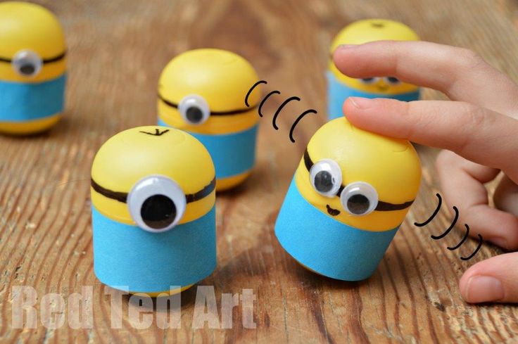 Coloca en el interior de una cajita de huevo Kinder un par de monedas de 1 ó 2 céntimos. Recorta una franja de cartulina con un ancho de 1,5 centímetros y pégala alrededor de la cajita. A continuación, pega los ojos en la caja, pero con mucho cuidado de qué Minion pretendes recrear, ya sabes que cada uno tiene unas caraterísticas oculares concretas. Por último añade los detalles con el rotulador negro y ¡listo! Su forma redondeada y las monedas de su interior, harán que tu pequeño Minion no pare de balancearse.
