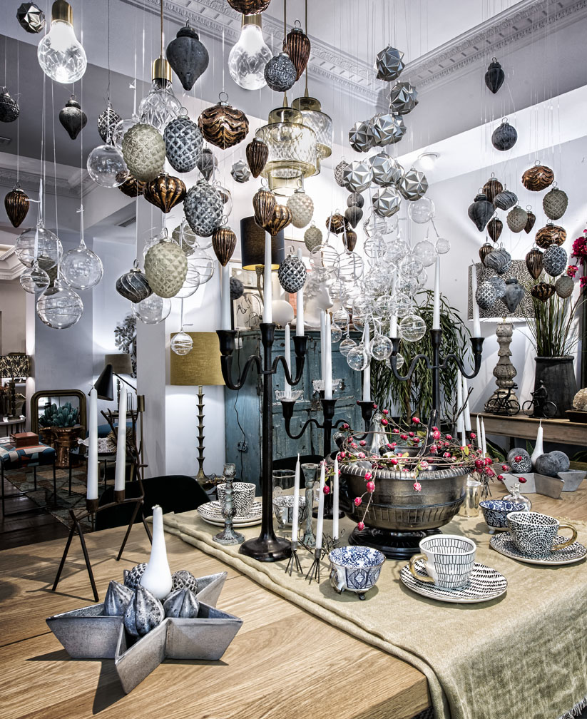 Si os gustan las velas, podéis combinar candelabros de diferentes tamaños y materiales y, cuando llegue la hora de servir la comida, retirar los más voluminosos y dejar solo los más pequeños. Una brillante idea es la de suspender del techo una serie de adornos navideños (bolas de cristal, piñas de madera…), situados a diferentes alturas por encima de la mesa. Pero tened la precaución de colocarlos de tal forma que vuestros invitados no se golpeen con ellos al levantarse de sus sillas.