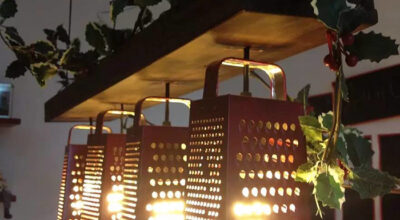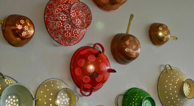 Las luces juegan un papel muy importante en en esta manera de reciclar. Colocando pequeñas bombillas en la pared y cubriéndolas con un colador, lograremos crear diferentes puntos de luz a través de los huecos. Puede ser una idea original para crear una luz tenue, ya sea en el salón o en nuestra terraza, por ejemplo.